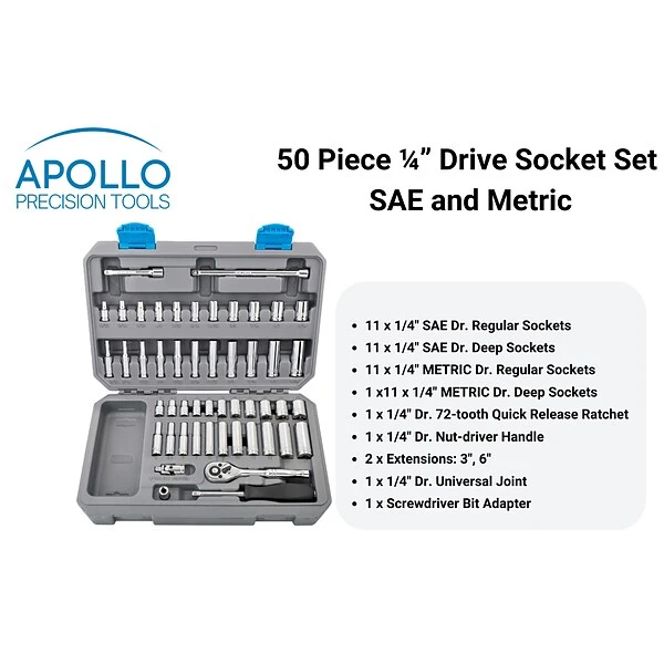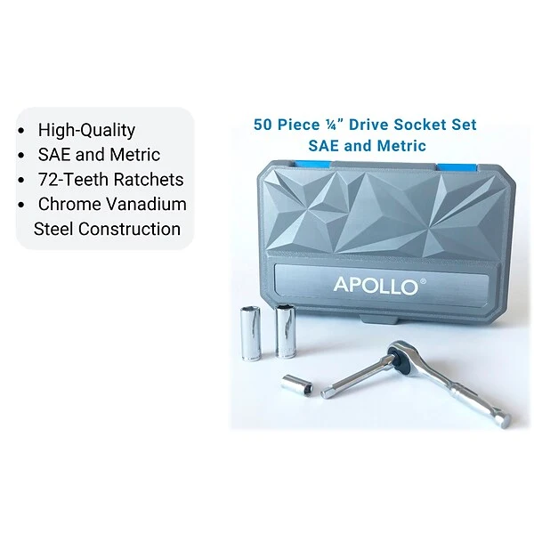 Great for avid mechanics and for everyday maintenance and repairs, this Apollo Tools extensive socket set is made of chrome vanadium steel and contains a selection of 1/4″ sockets and 1/4″ deep sockets in metric and SAE. The set also includes a 72-tooth quick-release ratchet and a 1/4″ nut driver handle, a 1/4″ drive universal joint, and a useful selection of adapters and extensions.