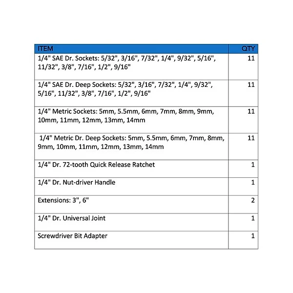 - Great for avid mechanics and for everyday maintenance and repairs, this extensive socket set contains a selection of 1/4″ sockets and 1/4″ deep sockets