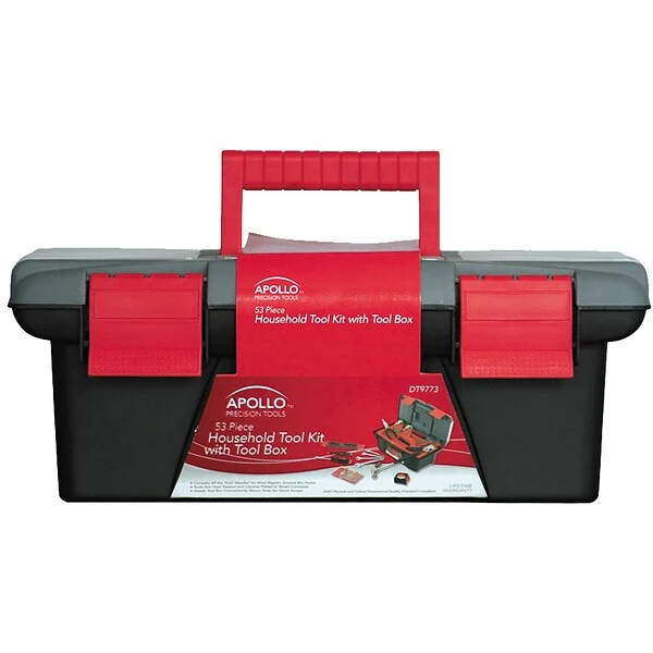 This Apollo 53 piece household tool kit with tool box contains all the tools needed for most repairs around the home, the tools are heat treated and chrome plated to resist corrosion, and come with a handy tool box which conveniently stores tools for quick access. Contains: 12ft (3.5m) Tape Measure, 8 oz Claw Hammer, 6″ Long Nose Pliers, 6″ Adjustable Wrench, Digital Voltage Tester, Bit Driver, Eight SAE Hex Keys: 1/16″, 5/64″, 3/32″, 1/8″, 5/32″, 3/16″, 7/32″, 1/4″; Eight Metric Hex Keys: 1.5mm, 2mm, 2.5mm, 3mm, 4mm, 5mm, 5.5mm, 6mm; Four SAE Combination Wrenches: 3/8″, 7/16″, 1/2″, 9/16″; Ten 1″ Bits: 1/8″, 5/32″, 3/16″, 1/4″; PH1, PH2, PH3; PZ1, PZ2, PZ3; Ten 1″ Bits: T10, T15, T20, T25, T27, T30, 1/8″, 5/32″, 3/16″, 1/4″; 9″ Level, Six Precision Screwdrivers: #1, #0; 1.4mm, 2.0mm, 2.4mm, 3.0mm.