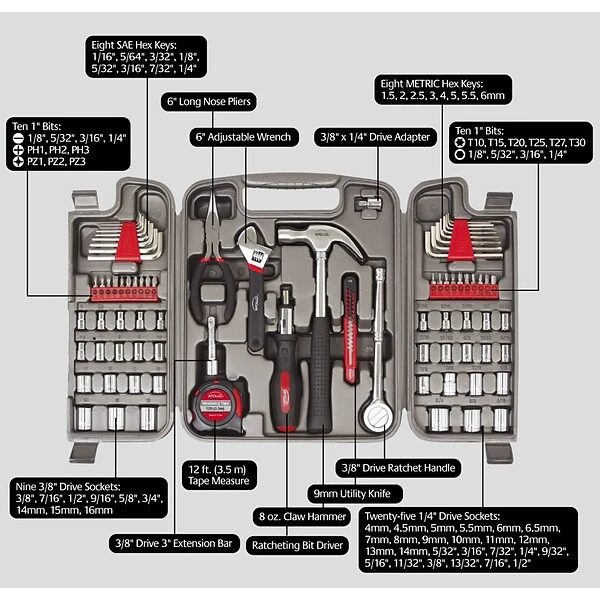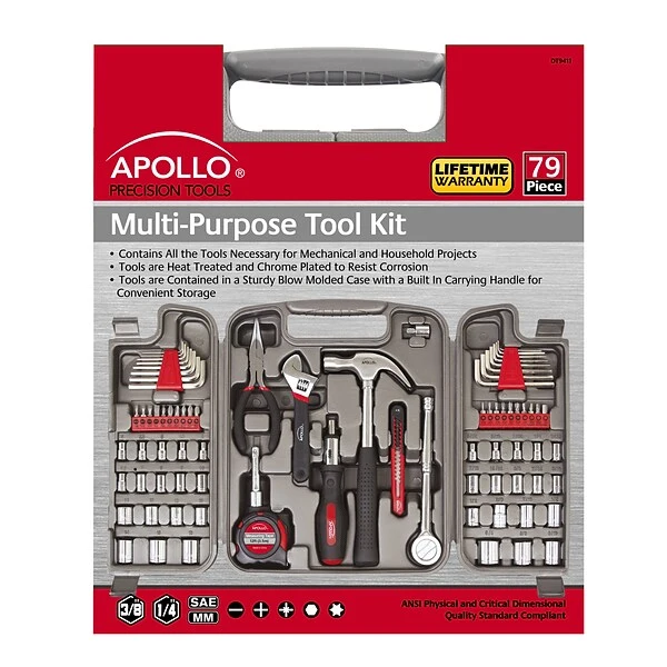 This Apollo 79 piece multi-purpose tool kit contains all the tools necessary for mechanical and household projects. Tools are heat treated and chrome plated to resist corrosion. Tools are contained in a sturdy blow molded case with built in carrying handle. Contains: Ten 1″ Bits: 1/8″, 5/32″, 3/16″, 1/4″, PH1, PH2, PH3, PZ1, PZ2, PZ3, Ten 1″ Bits: T10, T15, T20, T25, T27, T30, 1/8″, 5/32″, 3/16″, 1/4″, Eight SAE Hex Keys: 1/16″, 5/64″, 3/32″, 1/8″, 5/32″, 3/16″, 7/32″, 1/4″, Eight Metric Hex Keys: 1.5mm, 2mm, 2.5mm, 3mm, 4mm, 5mm, 5.5mm, 6mm, 6″ Long Nose Pliers, 6″ Adjustable Wrench, 8 oz Claw Hammer, 9mm Utility Knife, 12ft (3.5m) Tape Measure, Ratcheting Bit Driver, 3/8″ Drive Ratchet Handle, 3/8″ Drive 3″ Extension Bar, 3/8″ x 1/4″ Drive Adapter, Nine 3/8″ Drive Sockets: 3/8″, 7/16″, 1/2″, 9/16″, 5/8″, 3/4″, 14mm, 15mm, 16mm, Twenty-five 1/4″ Drive Sockets: 4mm, 4.5mm, 5mm, 5.5mm, 6mm, 6.5mm, 7mm, 8mm, 9mm, 10mm, 11mm, 12mm, 13mm, 14mm, 5/32″, 3/16″, 7/32″, 1/4″, 9/32″, 5/16″, 11/32″, 3/8″, 13/32″, 7/16″, 1/2″.