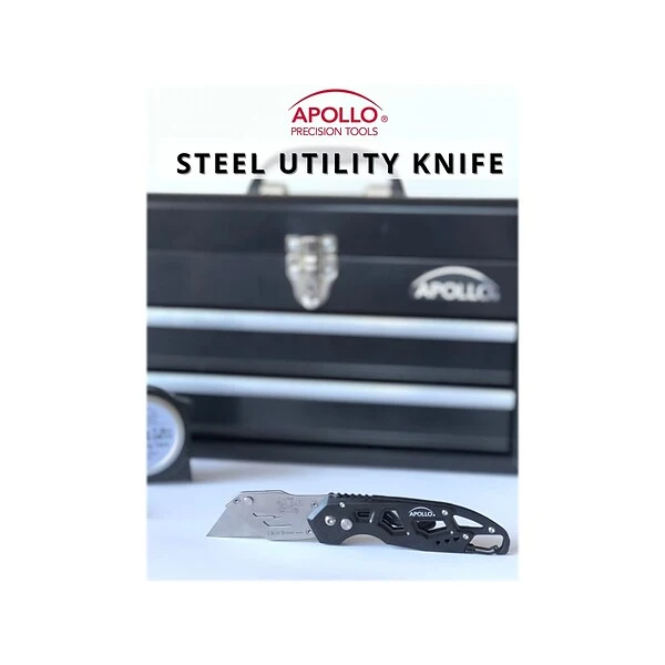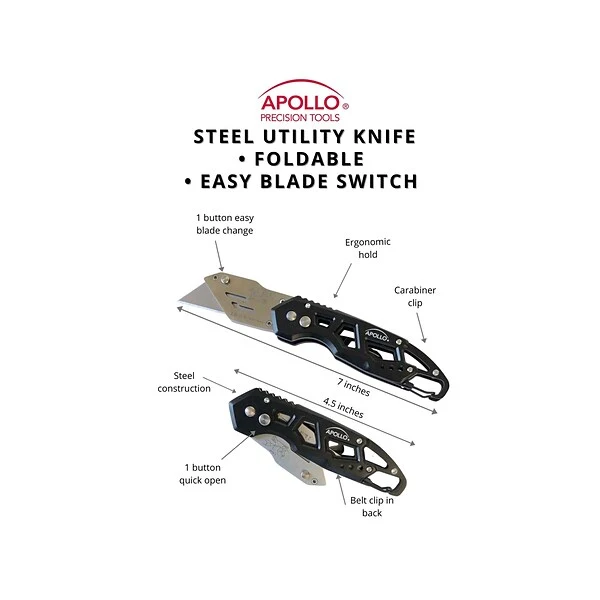 An improved version of Apollo Tools classic and highly popular foldable utility knife. They designed it for customers who were looking for a strong but lightweight, easy-to-fold, easy-to-open utility knife with a lock feature, a carabiner clip, and a belt hook. The ergonomic design ensures ease of use with minimal strain on the hand.