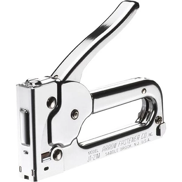 Arrow® Fastener junior tacker staple gun features hand contoured handle with built-in staple lifter. Stapler gun with visual refill window is ideal for kitchen shelf trim, closet lining, screen repair, light upholstery and cornice covering.