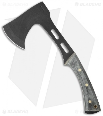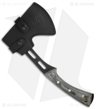 This durable axe is battle-ready. It is made to withstand tough chores, but it’s lightweight enough to take with you for camping, hunting, or other outdoor adventures. Made of high carbon 1075 steel, the axe head is finished with an epoxy black powder coating to enhance longevity. The handle is a gray micarta set with brass pins. It comes with a black leather sheath with snap closures and a belt loop for easy carry.