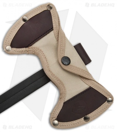 This Throwing Axe from Condor features a double bit design with a black traction powder coat and a tan paracord handle wrap. The axe is made from 1075 high carbon steel that has been heat treated and annealed to approximately 50-55 rockwell hardness. It has a paracord wrapped handle for improved grip and survival applications. Item includes a canvas sheath with a leather belt loop attachment.