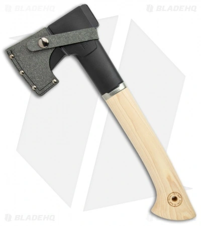 The Fiskars Norden series includes the same nearly indestructible head attachment system, with handles made of seasoned hickory. The black finished heads are protected by recycled leather sheaths. The N7 is 14″ overall.