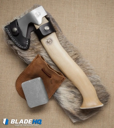 The Stoerre Unna Áksu, or “The Great Little Axe”, has a natural birch handle and a 12C27 stainless steel axe blade. It is 11.75″ overall and has a 2.625″ polished satin blade. The handle is composed of reindeer antler and birch wood in a natural finish. This axe includes a black leather sheath and a diamond sharpening stone with a brown leather drawstring pouch. Karesuando Kniven uses time-tested materials and techniques from the Lapland region of Sweden to create the highest quality cutting tools.