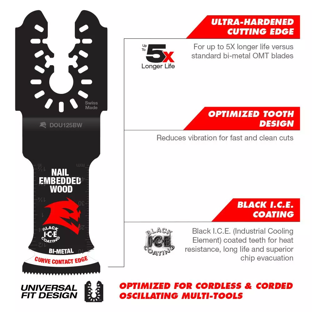 DIABLO’s universal fit bi-metal oscillating blades feature application specific designs that deliver maximum durability and longer life in nail-embedded wood applications. These high-performance blades feature an ultra-hardened cutting edge to deliver up to 5X longer life than standard blades. Curve contact edge creates a pilot for precise, clean plunge cuts with less vibration. Black I.C.E. (Industrial Cooling Element) keeps the teeth cool and build up free for fast, clean cuts. The blade’s universal fit, adapter-free design easily attaches most tools, with the exception of Starlock tools.