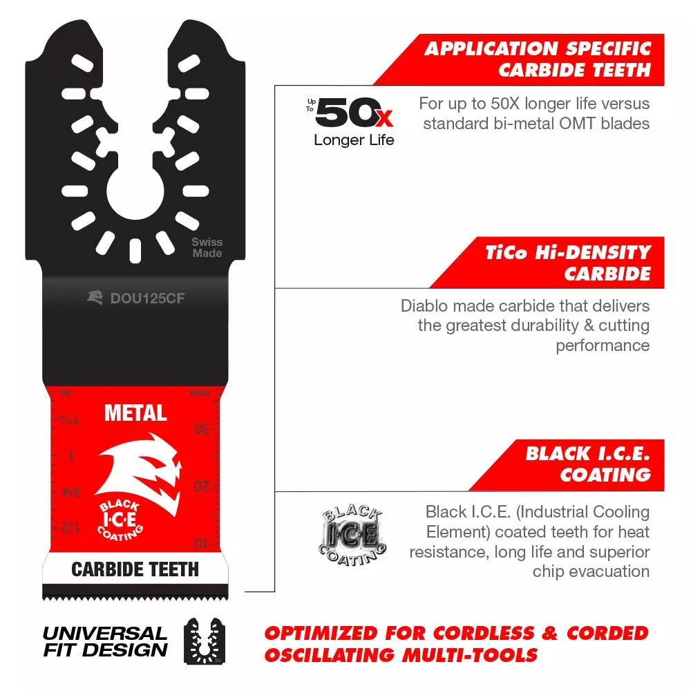 DIABLO’s universal fit carbide oscillating blades feature application specific designs that deliver extreme durability and superior cutting life in metals. High-performance carbide teeth deliver an unmatched up to 50X longer cutting life versus standard bi-metal blades. An optimized blade and tooth design along with Black I.C.E. (Industrial Cooling Element) keeps the teeth cool and build up free for fast, clean cuts. The blade’s universal fit, adapter-free design easily attaches to most tools, with the exception of Starlock tools.