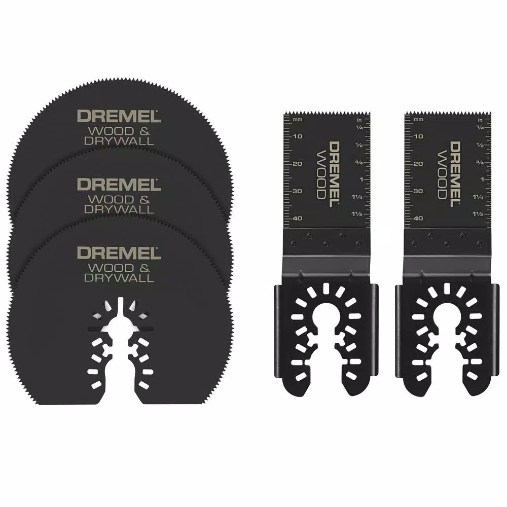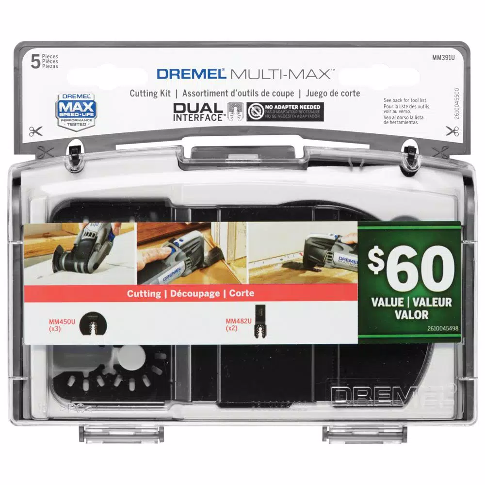 The Dremel 5-Piece Multi-Max Cutting and Variety Kit offers 5 cutting accessories. Dremel universal oscillating accessories are the first truly universal oscillating accessories available that require no adapter. The unique dual interface fits most competitive Oscillating Tools, including those with a quick change feature. 3 blades work with wood and drywall, while 2 are designed for wood and metal flush cutting.
