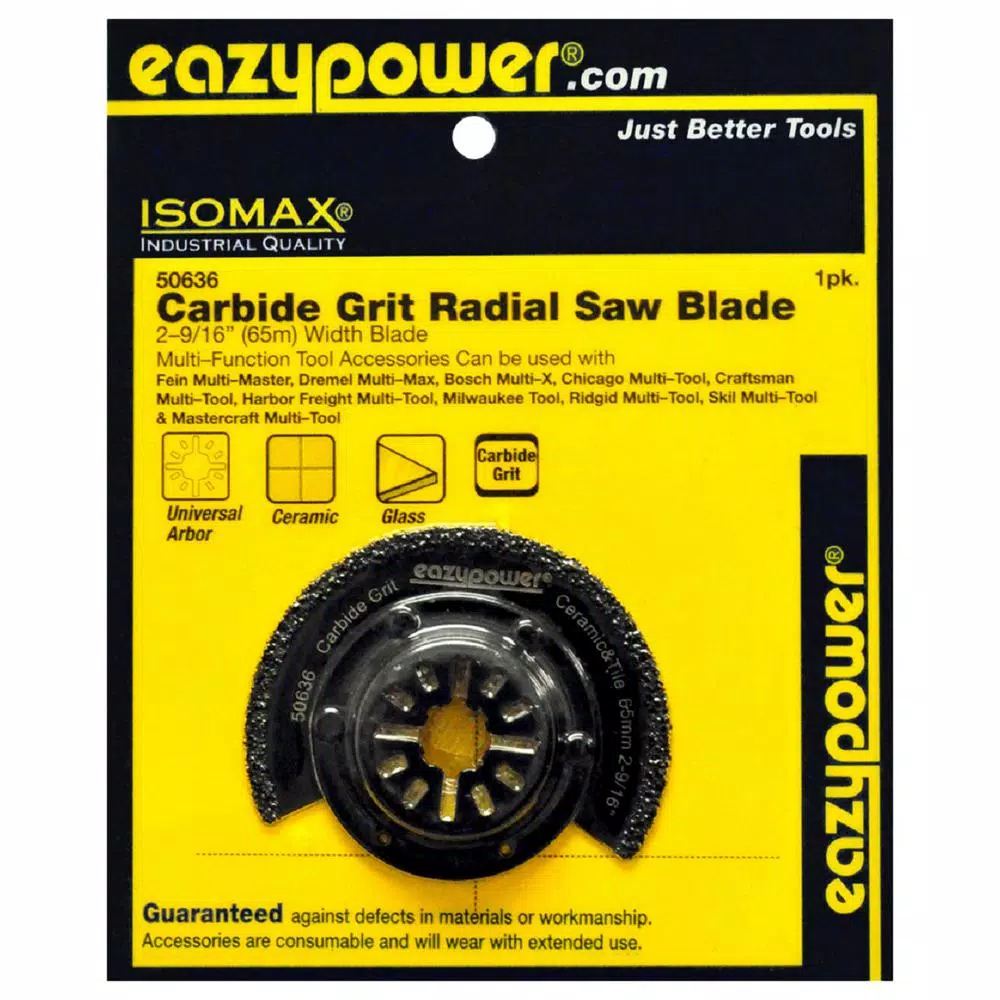 Recommened for cutting Tile, Grout, Ceramic, Glass, Porous concrete and more. Radial Saw Blade shape ideal allows this cutter to completely work all the way into the corners without damaging opposing walls or surfaces. Not compatiable with Starlock Models Oscillating Blade Carbide Grit Radial Saw Blade 2-9/16 in. (65mm) Width Blade.
