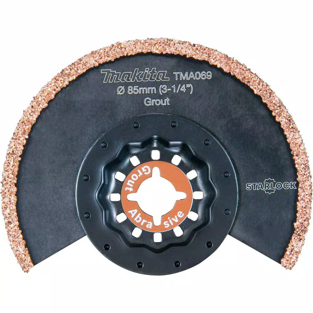 The Makita 3-1/4 in. Starlock Grout Removal Blade is engineered for cutting smaller cutouts in soft wall tile. This blade is ideal for removing grout or thin-set for tile repair and removing hard caulking or hardened glue. The tungsten carbide edge provides increased performance and longer accessory life. The Starlock Interface is compatible with most oscillating multi-tools (sold separately).