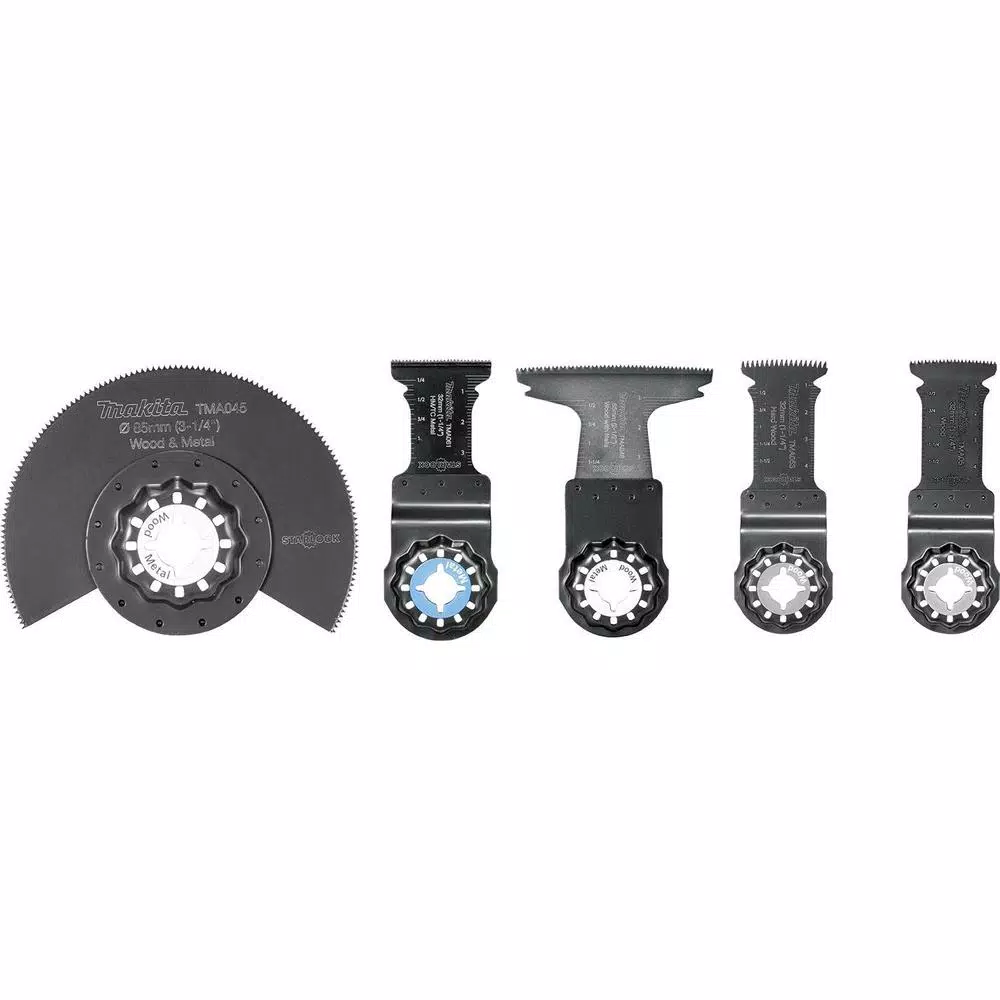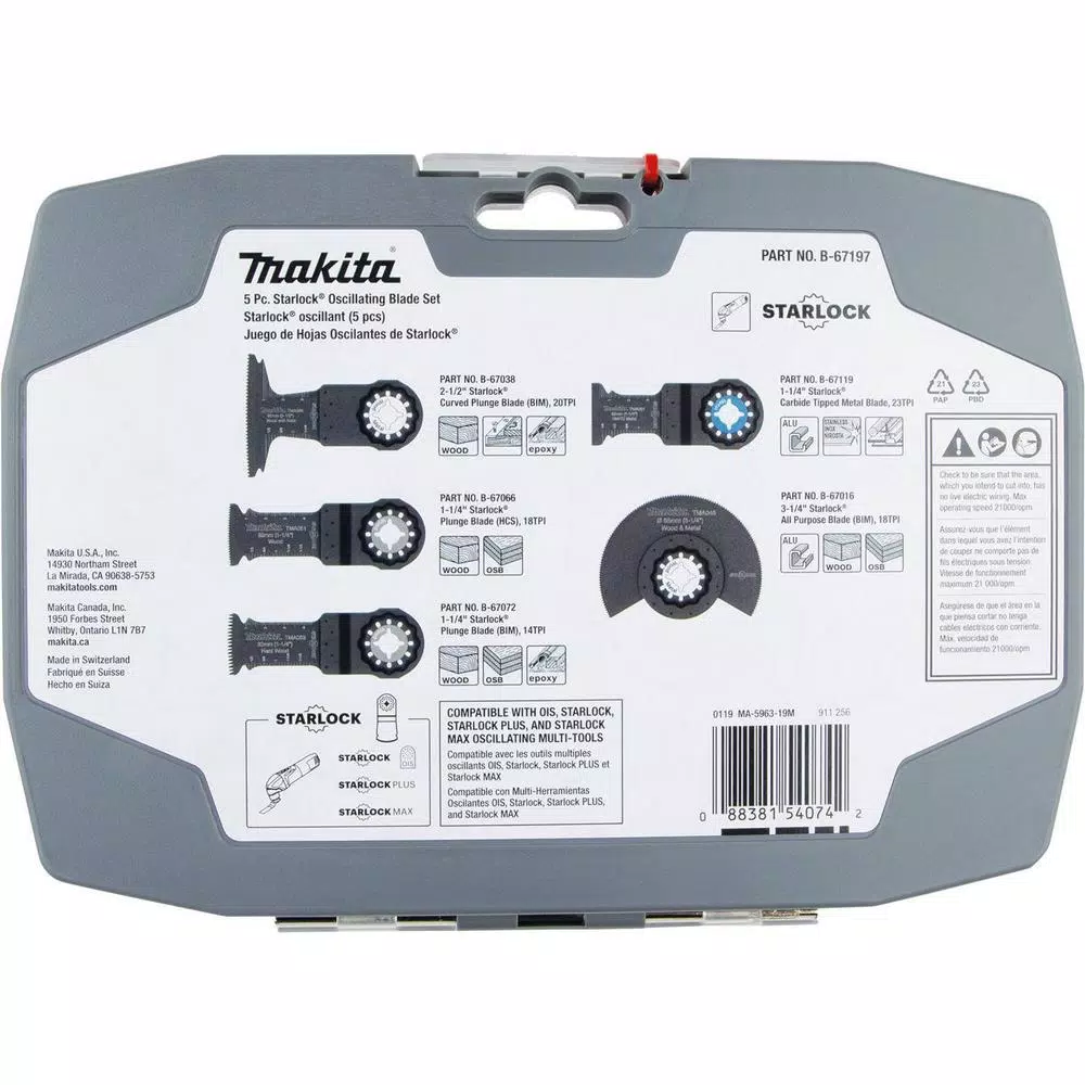 The Makita 5-Piece Starlock Oscillating Blade Set is engineered for precise and clean cuts. The set is ideal for cutting wood and metal. The set includes the 3-1/2 in. Starlock All Purpose Blade (B-67016), 2-1/2 in. Starlock Curved Plunge Blade (B-67038), 1-1/4 in. Starlock Plunge Blade – 18TPI (B-67066), 1-1/4 in. Starlock Plunge Blade – 14TPI (B-67072), and 1-1/4 in. Starlock Carbide Tipped Metal Blade (B-67119). The Starlock Interface provides maximum performance and is compatible with most oscillating multi-tools (sold separately).