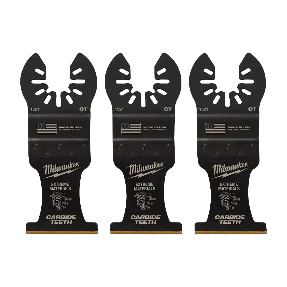 The MILWAUKEE Universal Fit OPEN-LOK 1-3/8 in. Titanium Enhanced Carbide Teeth Extreme Material Blade 3 Pack is designed for Oscillating Multi-Tools. It has a unique aggressive tooth design that offers users optimal cutting performance in wood, screws, metal pipe, nails, cement board, plaster, and more. The 1-3/8 in. Titanium Enhanced Carbide Teeth Extreme Material Blade lasts up to 50X longer than standard bi-metal blades and can be used in a wide range of materials for the longest blade life. The unique, aggressive carbide tooth design offers faster cuts and better cutting performance in wood when compared to standard carbide blades. These Milwaukee multi-tool blades are designed with global materials.