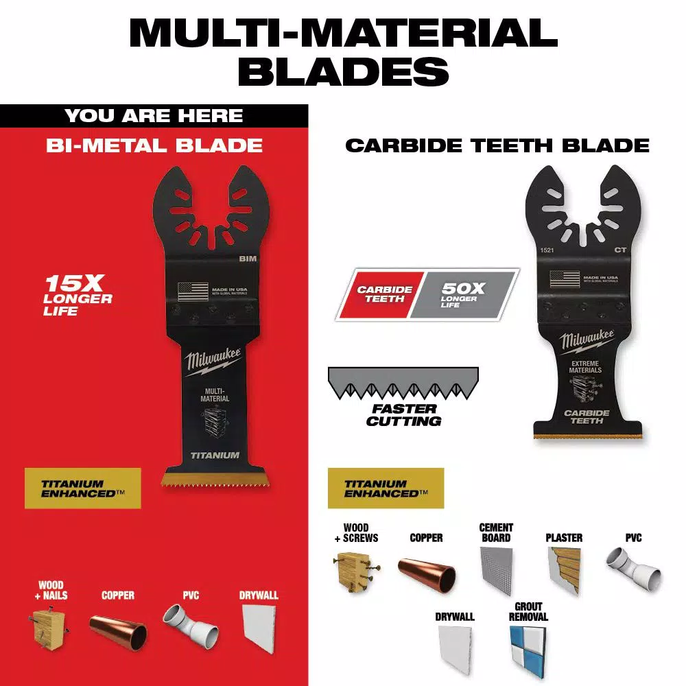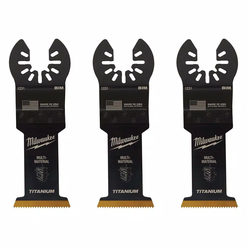 The MILWAUKEE Universal Fit OPEN-LOK 1-3/8 in. Titanium Enhanced Bi-Metal Multi-Material Oscillating Multi-Tool Blade 3 Pack is made from premium high-speed steel. This 1-3/8 in. bi-metal blade is ideal for cuts in wood, nails, PVC, and drywall. The titanium enhanced bi-metal multi-tool blades deliver faster cuts vs the previous generation, featuring more teeth with an increased cutting width and a deeper plunge cut. These oscillating multi-tool blades are designed with global materials.