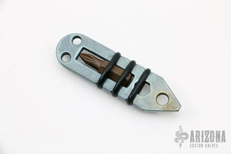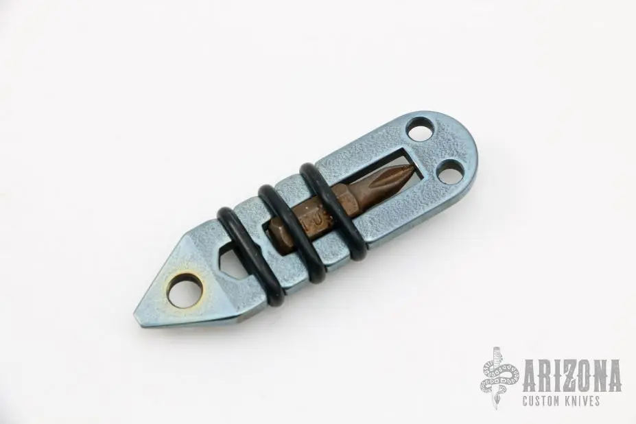 “Made of aircraft grade 6AL4V titanium, this unique multitool features a 1/4″ hex driver bit with hex bit holder and O-ring retention system, 1/4″ wrench and screwdriver/pry tip. Also makes a great key fob.” Stonewashed and anodized 6AL4V titanium. Excellent condition. Comes with original bag and card.