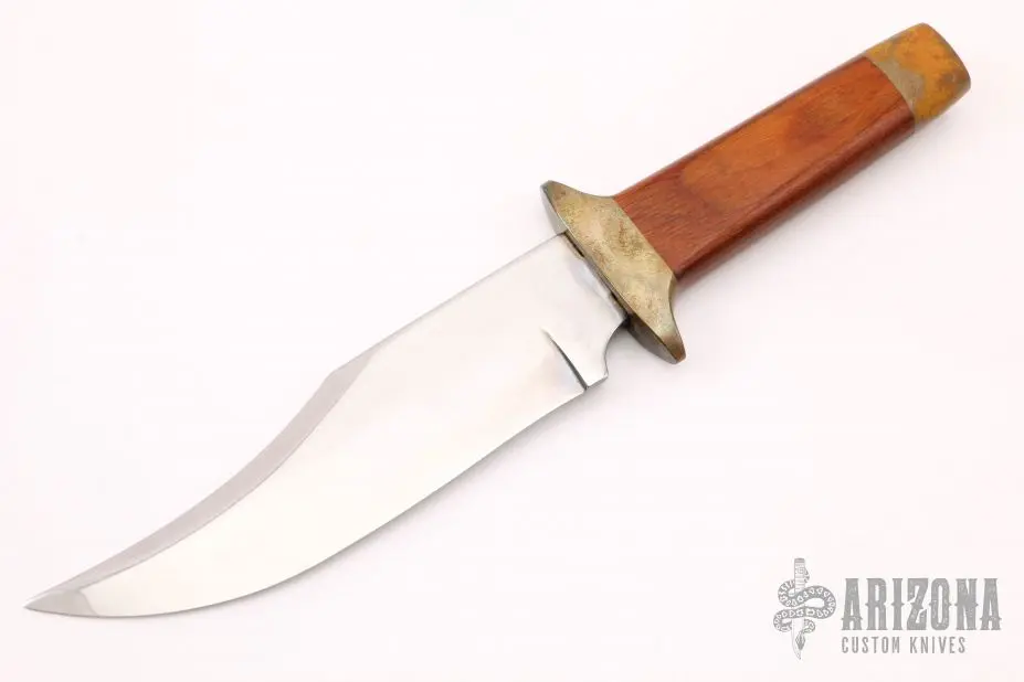 This bowie from Colt features mirror polished blade with false edges (this knife is not sharpened, but could be pretty easily if you wanted to), .200″ blade stock and 1.611″ blade depth, hidden tang construction. The handle has a brass guard and butt with wood grip. The blade is deeply etched with a western scene and “The Gun That Won The West”. Has a little patina on the brass, otherwise excellent condition.