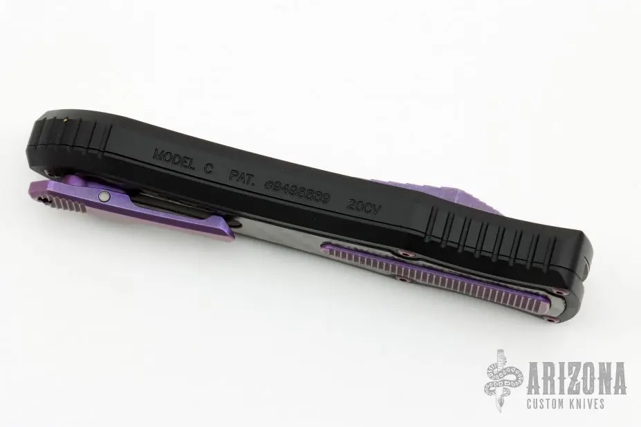 This knife is a Deadlock Model C by Grant and Gavin Hawk. It has a double-edged stonewashed blade. The handle has a carbon fiber and black aluminum frame with a tip down spring clip, titanium. The thumb slide on the handle is also anodized titanium, with anodized hardware and anodized titanium overlays. Comes with a cloth pouch. Grant and Gavin Hawk set out to create a double action OTF with no blade play…. They did it, NO blade play. Comes with tool, cloth pouch. Has a couple light scuffs on the frame. Excellent condition otherwise.
