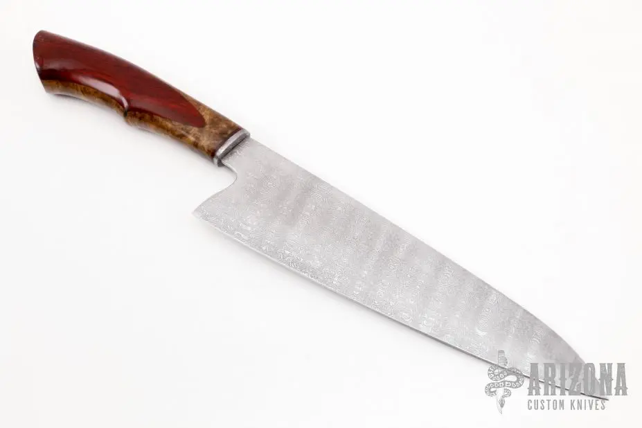 This Knife by SMID Damascus features a Deep-Core Mosaic Damascus blade with .109″ blade stock and 2.085″ blade depth, hidden tang construction. The handle has a Damascus guard, maple burl wood grip with paddock wood. Comes with a zippered case and COA. New from maker.