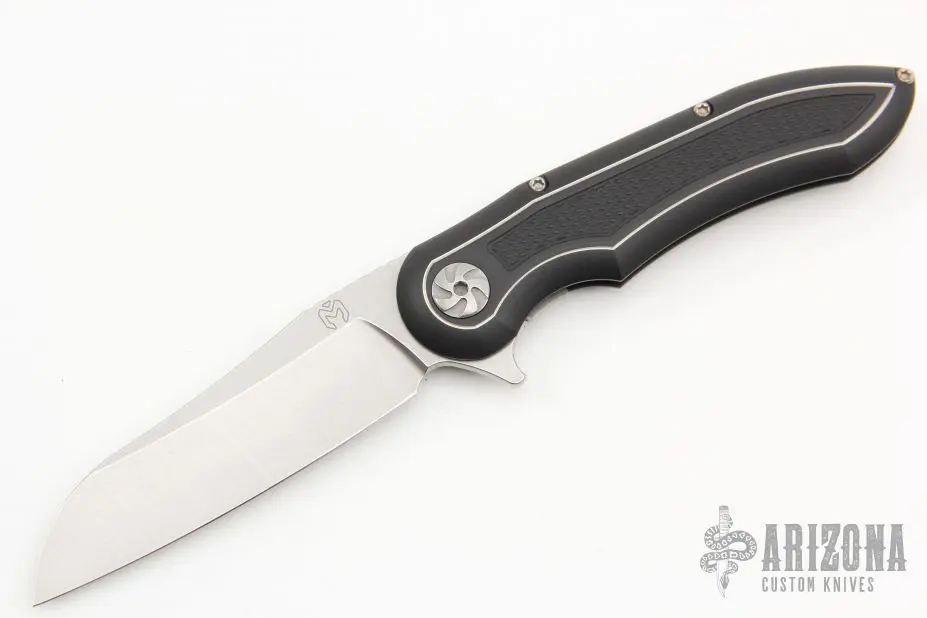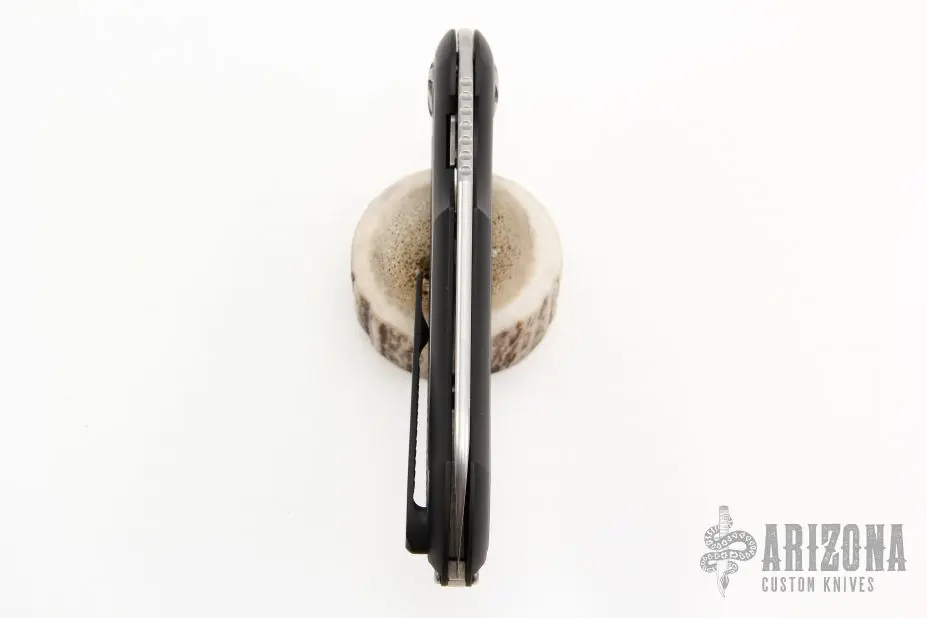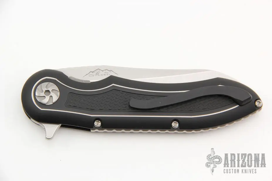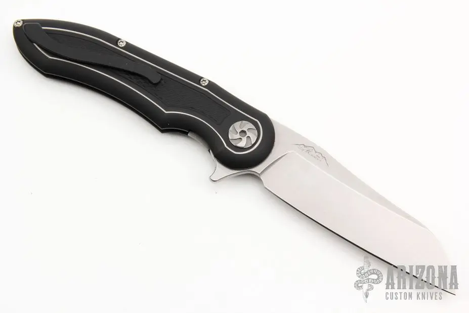 The Max Evolution by Jerry Moen features a stonewashed sheepsfoot style blade. The handle is composed of black titanium with matching tip up titanium pocket clip with hidden screws. The lockbar is nicely recessed into the handle scale. Excellent condition. Comes with a zippered case.