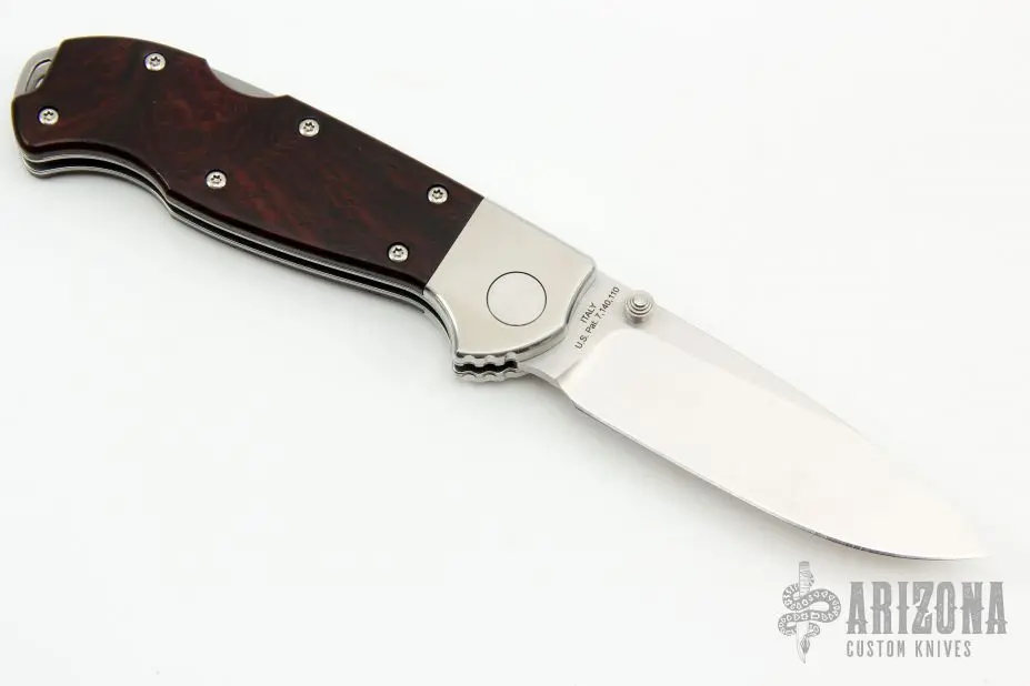 Designed by Ron Lake, the Model-1 is a highly refined, Italian crafted knife. The LakeR Model-1 lockback knife features Ron Lake’s patented dual safety mechanism, a simple slide interface that locks the blade in both the open and closed positions. It is outfitted with a modified drop point blade that features a caping finger nest jog at the tip along with dual thumb studs for simple one-hand operation. This one has a Cocobolo wood handle with brushed satin stainless steel bolsters and liners with a slot for lanyard attachment. Included with the Model 1 is a premium leather sheath for belt carry. Excellent Condition.