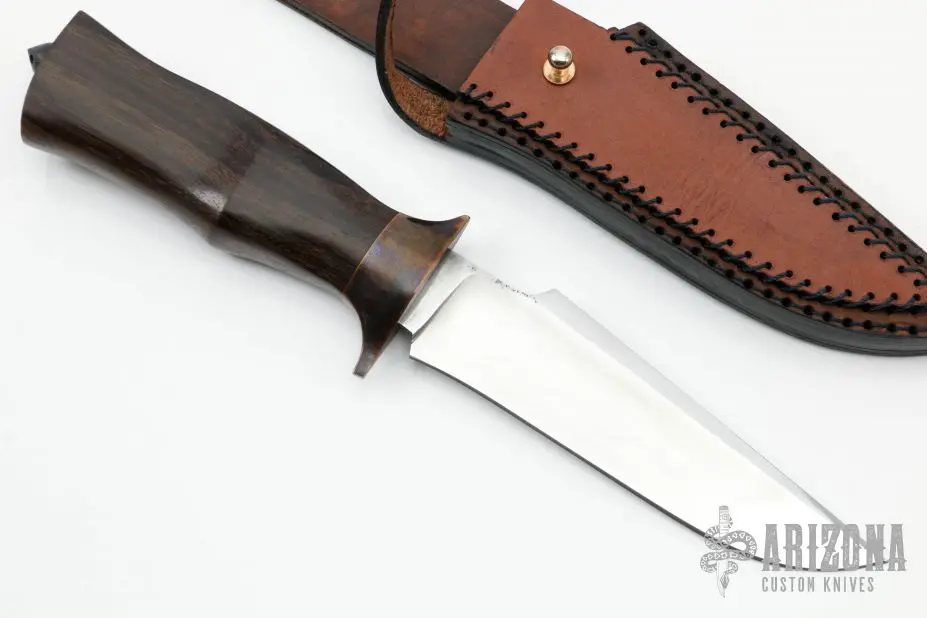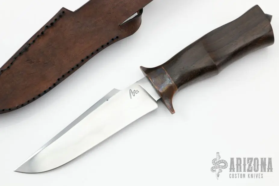 This Raptor by Murad Custom Knives features a hand rub satin finished blade with nice hamon and false top edge, .143″ blade stock and 1.261″ blade depth, hidden tang construction. The handle has an antiqued brass guard and a Japanese Rosewood grip. Comes with a brown leather sheath and COA. New from maker. This knife is a take down model and by removing the tang nut you can remove the handle.
