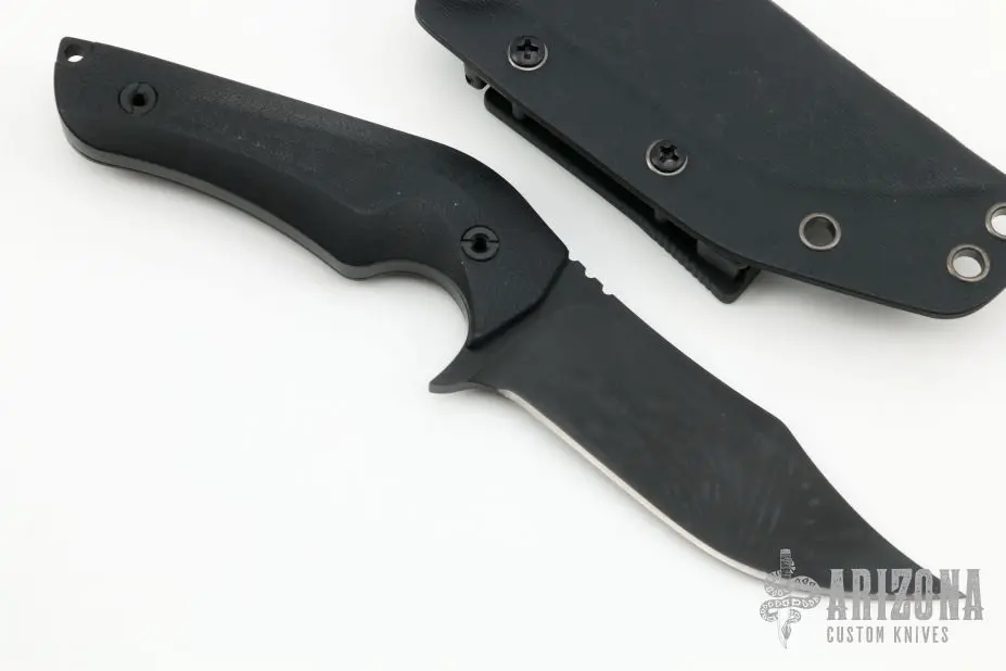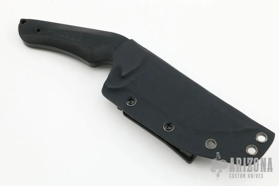 The Stryker is an extraordinary bowie style fixed blade knife with black Cerakote finish. It Features a strong clip point D2 blade with full tang construction complimented by a heavily milled, skeletonized handle that helps achieve a wonderful balance and also sheds the weight that is the enemy of those on the move. This knife has the unique advantage of heavy-duty durability that can handle the most adverse conditions while being extremely light weight. The handle’s 3D machined black G10 handle scales are specifically contoured to naturally secure a strong, tight grip. Confident, controlled cuts are readily achieved with the jimped thumb ramp handle while intuitively designed ergonomics feature an arcing shape that feels natural in the hand and terminates at a sharp pommel. Each Stryker Fixed Blade knife includes a secure lightweight kydex sheath with a belt loop system.