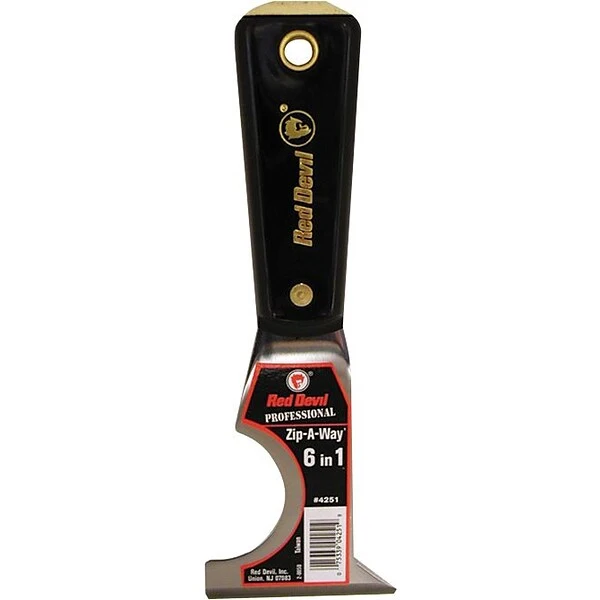 Red Devil® Zip-A-Way® Professional 4200 Series Stiff 6-in-1 Painters tool is made of high carbon steel and has black nylon solvent resistant handle for comfort grip. Mirror-finished tool has lacquered blade that helps to prevent rust.